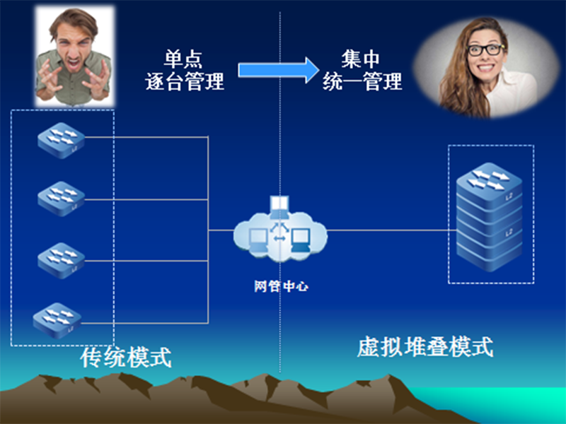 Virtual stacking can virtualize multiple independent switches into one device for centralized management, simplifying and simplifying maintenance.