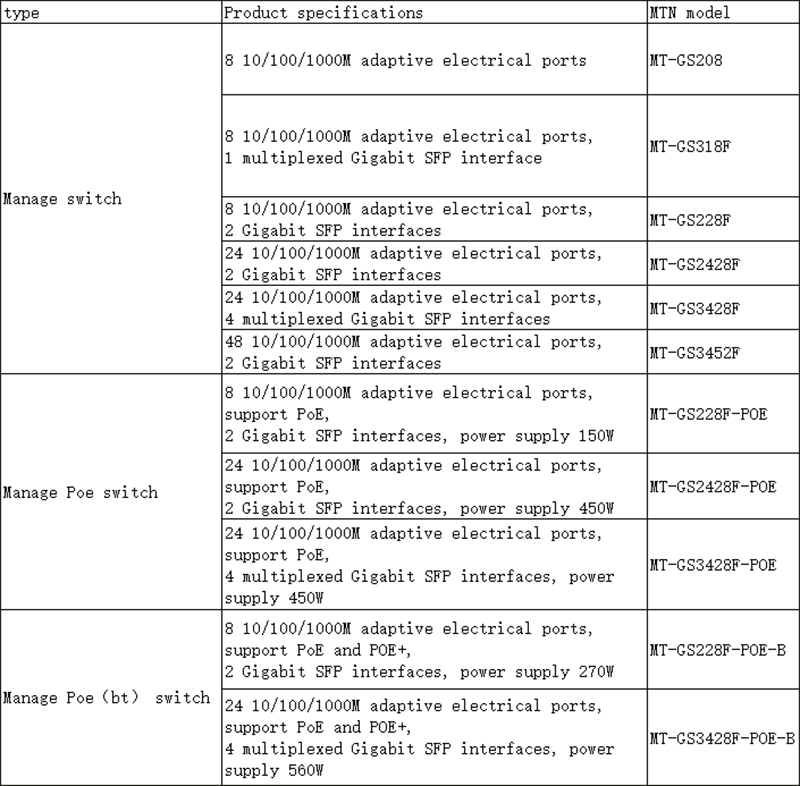 The following switch products of MTN Layer 3 and Layer 2 network management have been delivered and successfully deployed by many global famous brand manufacturers.